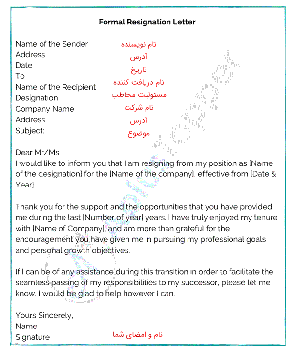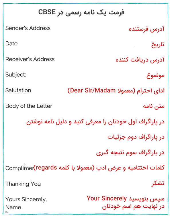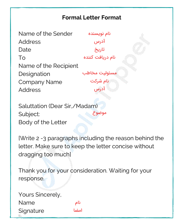 عبارت پایانی: عباراتی مانند Sincerely یا Yours truly. این بخش باید محترمانه و رسمی باشد.